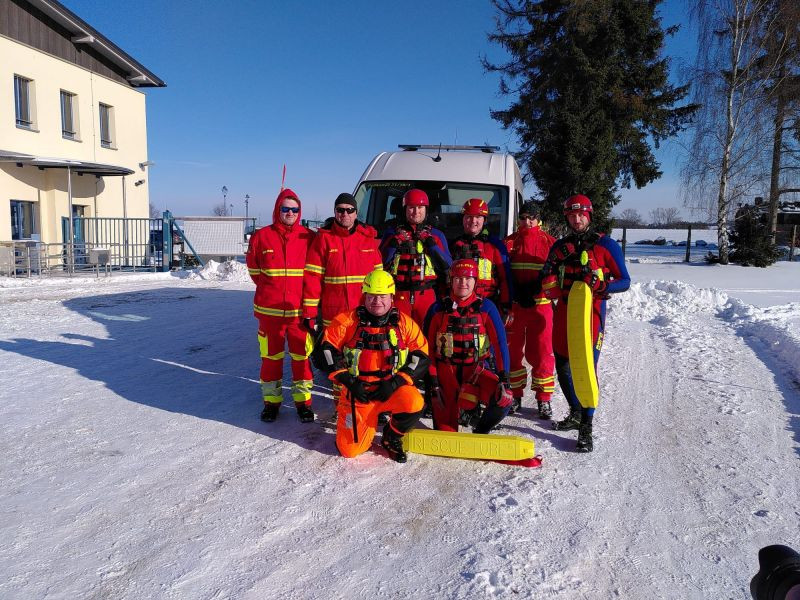Im Anschluss an das Badevergnügen haben unsere beiden technischen Leiter Einsatz Justus und Julian nochmal gezeigt, wie sie eine ins Eis eingebrochene Person retten würden - natürlich angeleint und mit den nötigen Hilfsmitteln. Tony, der im Wasser auf Hilfe wartet, trägt einen Überlebensanzug über seiner Kleidung, der ihn vor dem kalten Wasser schützt.