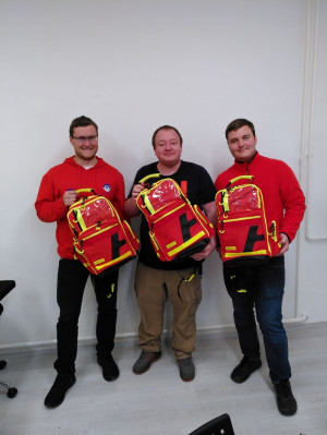 Überraschend gab es eine Sachspende: Tony übergab den Technischen Leitern Einsatz drei Notfallrucksäcke (etwas größere KFZ-Verbandkästen mit Beatmungsbeutel und Blutdruckmessgerät), mit denen unsere Einsatzfahrzeuge demnächst für alle Notfall-Situationen gerüstet sein werden.