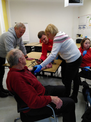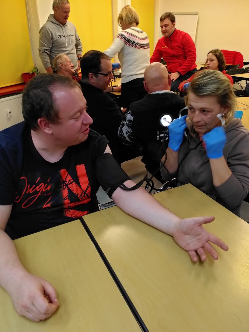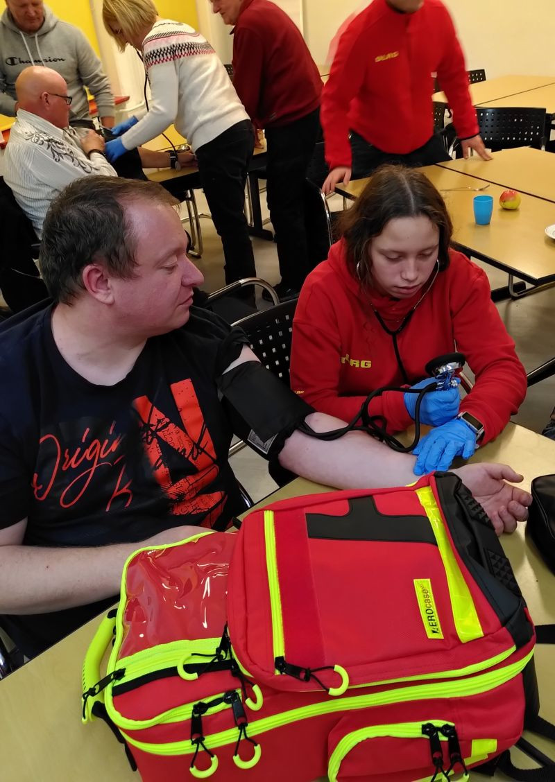 Die Notfallrucksäcke wurden sogleich inspiziert. Die angehenden Sanitätshelfer testeten Blutdruckmanschetten und Stethoskope auf Funktionstüchtigkeit und haben dabei gleichzeitig das Blutdruckmessen geübt.